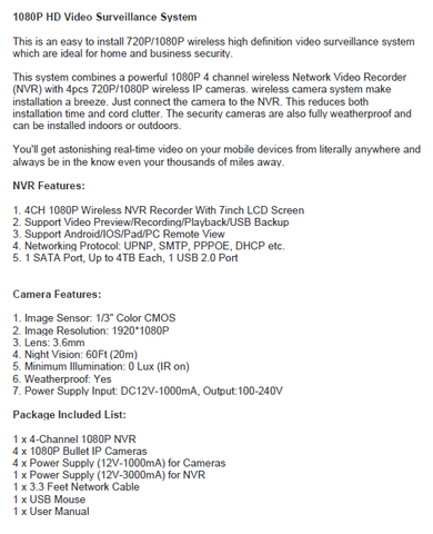 •   4 x 1080P WIFI Camera (4 CH NVR Kit) / 2 x 1080P WIFI Camera (2 CH NVR Kit)